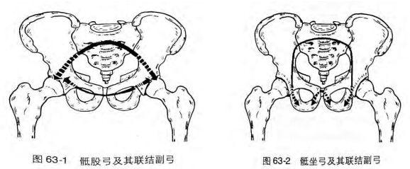 - 骶股弓的副弓经耻骨上支与耻骨联合至双侧髋关节,以连接骶股弓和另一个副弓