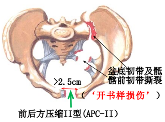 | 一侧或两侧耻骨支的垂直骨折,或耻骨联合分离(< 2.5 cm),骶棘韧带、骶结节韧带、骶骼前、后韧带完整。(稳定型骨折) | 耻骨联合分离(> 2.5 cm),骶骼前韧带断裂,骶骼后韧带完整,骶骼关节前侧张开,骶棘韧带断裂,骶结节韧带断裂,骨盆呈现典型的开书样损伤,骨盆旋转不稳定。 | 耻骨联合完全分离、骶骼关节所有韧带断裂伴侧方移位,半骨盆分离,完全不稳定,所有韧带支持结构的断裂,但无垂直移位,合并血管损伤、大量出血的概率较高。 |