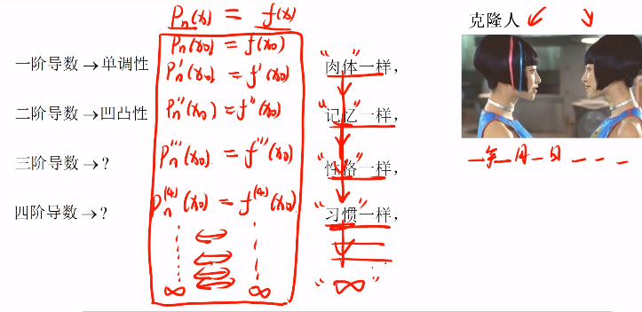 再形象一点,克隆一个人,在某一个时间点,将肉体,记忆,性格,习惯等等无穷多个要求都一样,就克隆完全一样的了,现在和未来都一样。这就是泰勒公式